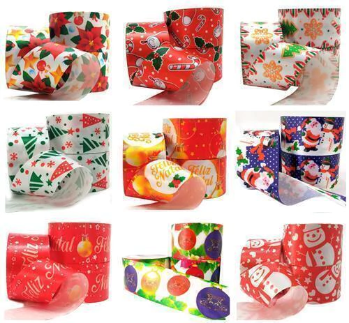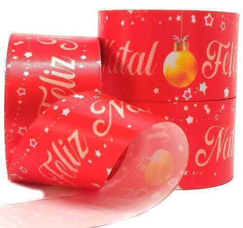 Produzidas em cetim premium, com 38mm de largura (N9) e 10 metros por rolo, essas fitas trazem estampas clássicas que remetem à magia natalina — Papai Noel, bonecos de neve e flores de Natal.